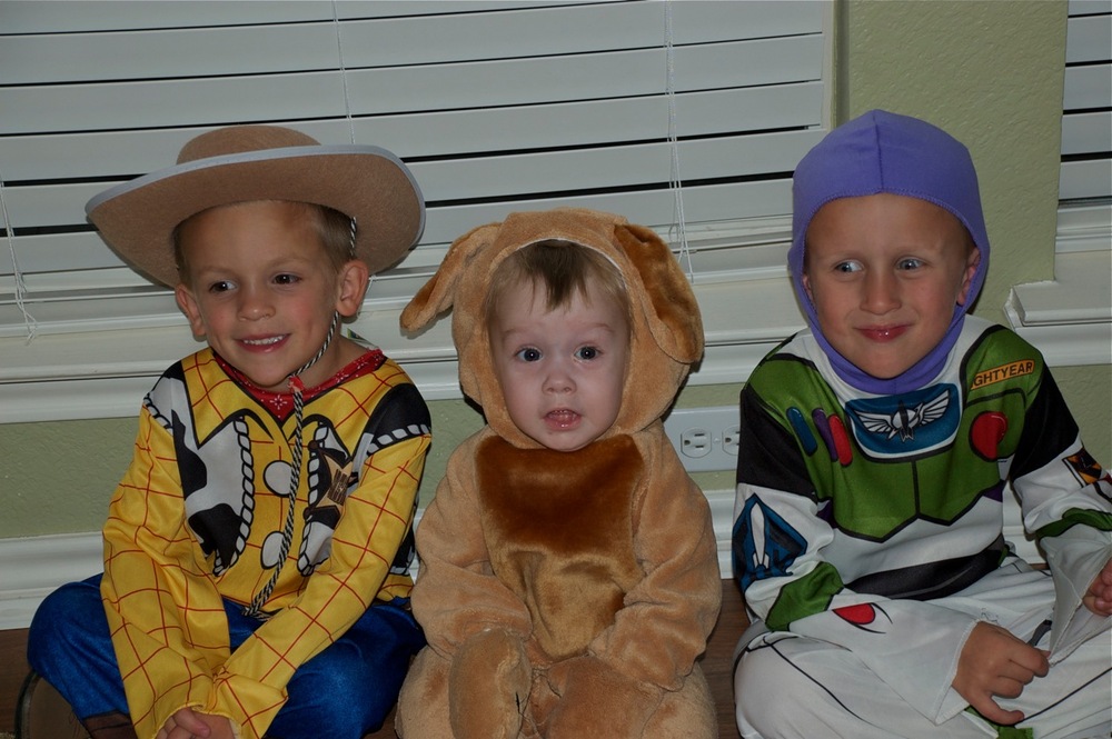 Posted on November 4, 2010March 17, 2013 in Uncategorized Woody, Colt, and Buzz. Here’s our cast of characters on Halloween night. Share this: Click to share on X (Opens in new window) X Click to share on Facebook (Opens in new window) Facebook Like Loading... Related