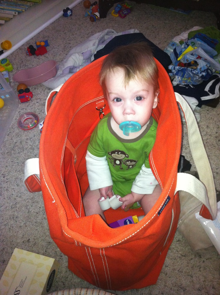 Brittany took her new AWESOME bag, that Aunt Liz got her for Christmas, to the hospital with her & Colt. This morning she was cleaning it out & Colt wanted to help. Perfect fit!!